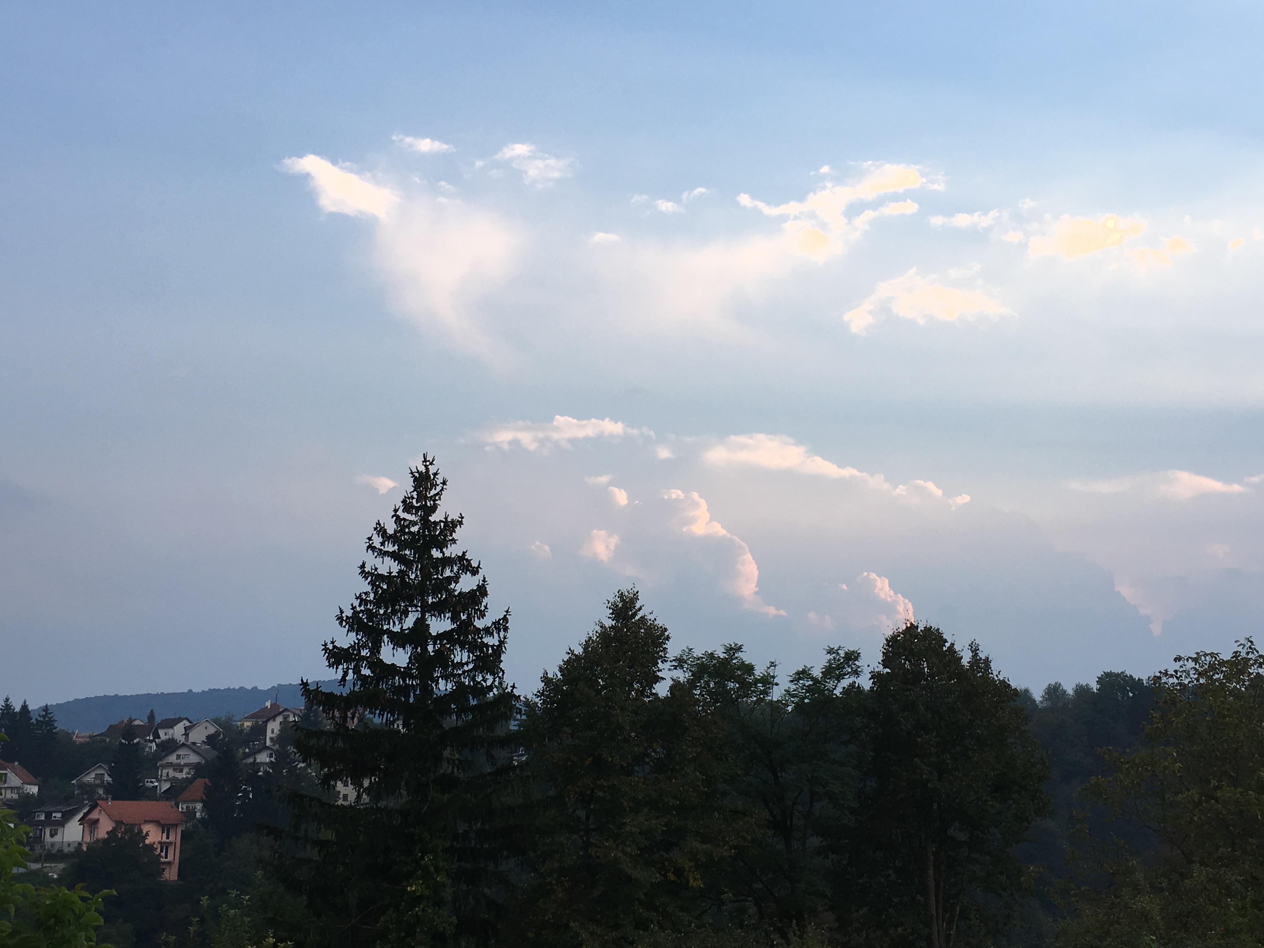 해가 질 무렵 저녁을 준비하기 위해 슬루니(Slunj)에 있는 마켓으로 걸어갔다. 혼자 여행할때는 번화가가 아니면 어두워질 때까지 밖에 있지 않는 편이다. 그래서 대부분은 저녁은 숙소에서 해 먹거나 사다 먹는다. 마켓에서 빵과 과일 요구르트 커피 등을 사 가지고 와서 숙소에서 저녁을 해결했다. 숙소 창문을 통해 바라본 풍경은 불타는 듯한 노을은 아니었지만 평화롭고 아름다웠다.